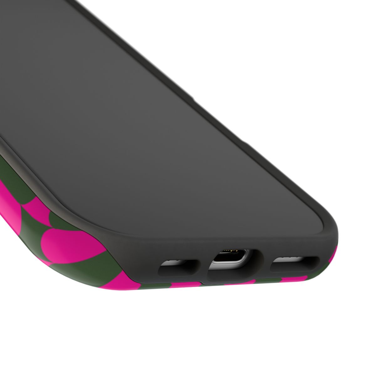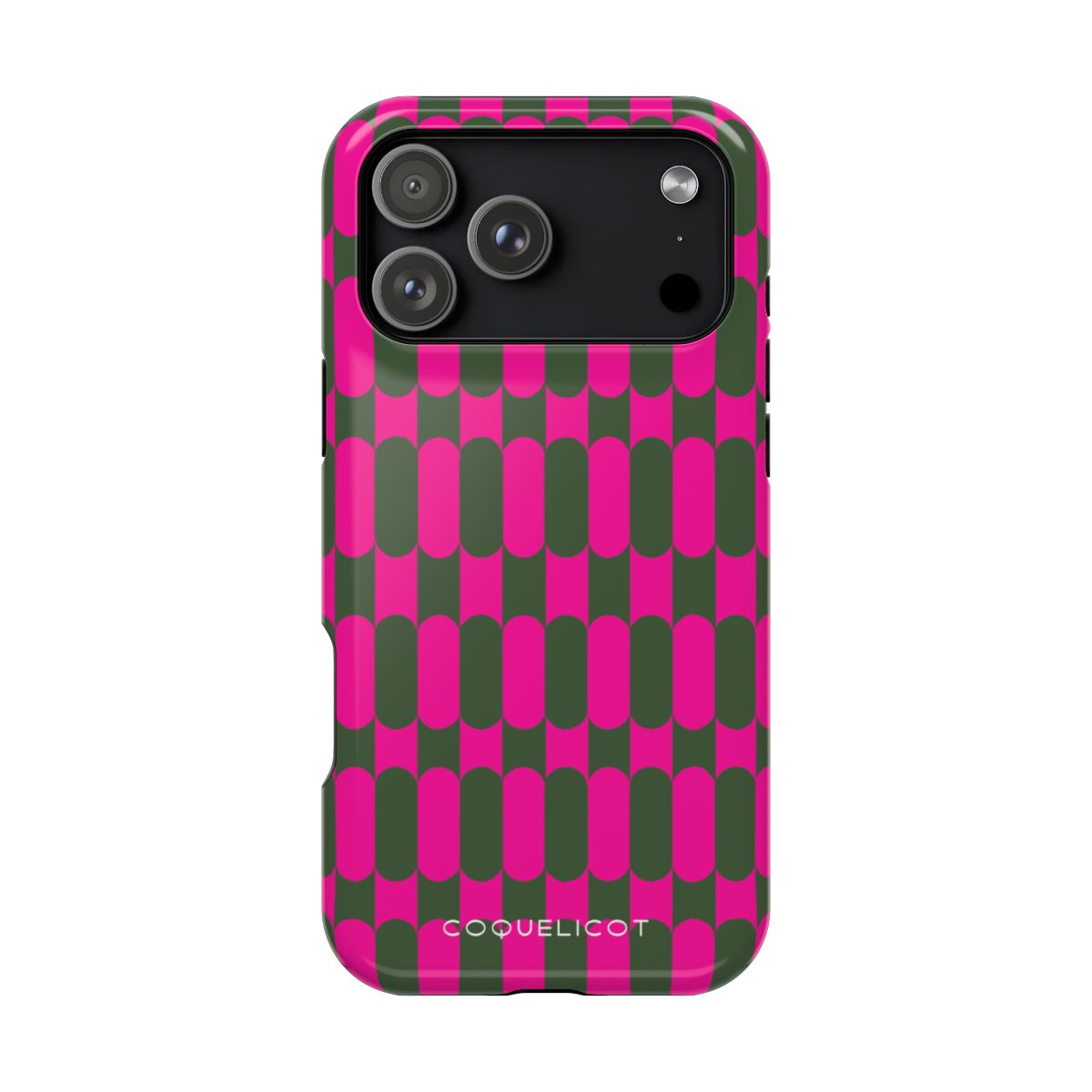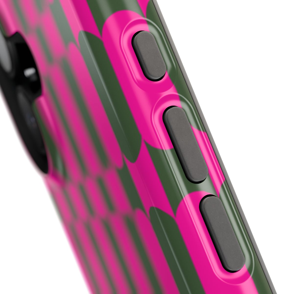 The interplay between vibrant pink and deep green creates a striking contrast, giving this colourful iPhone case an immediate visual impact. The repetitive shapes create a sense of gentle, almost hypnotic movement.