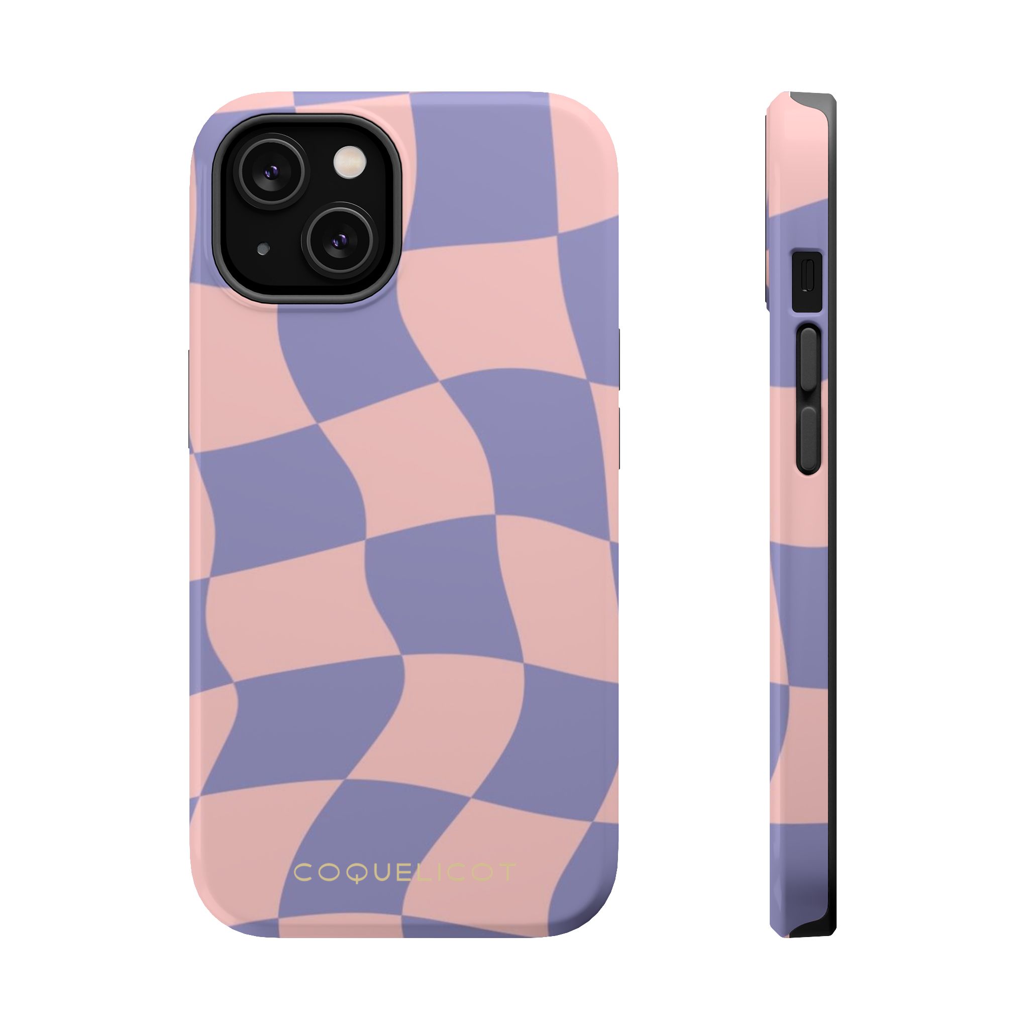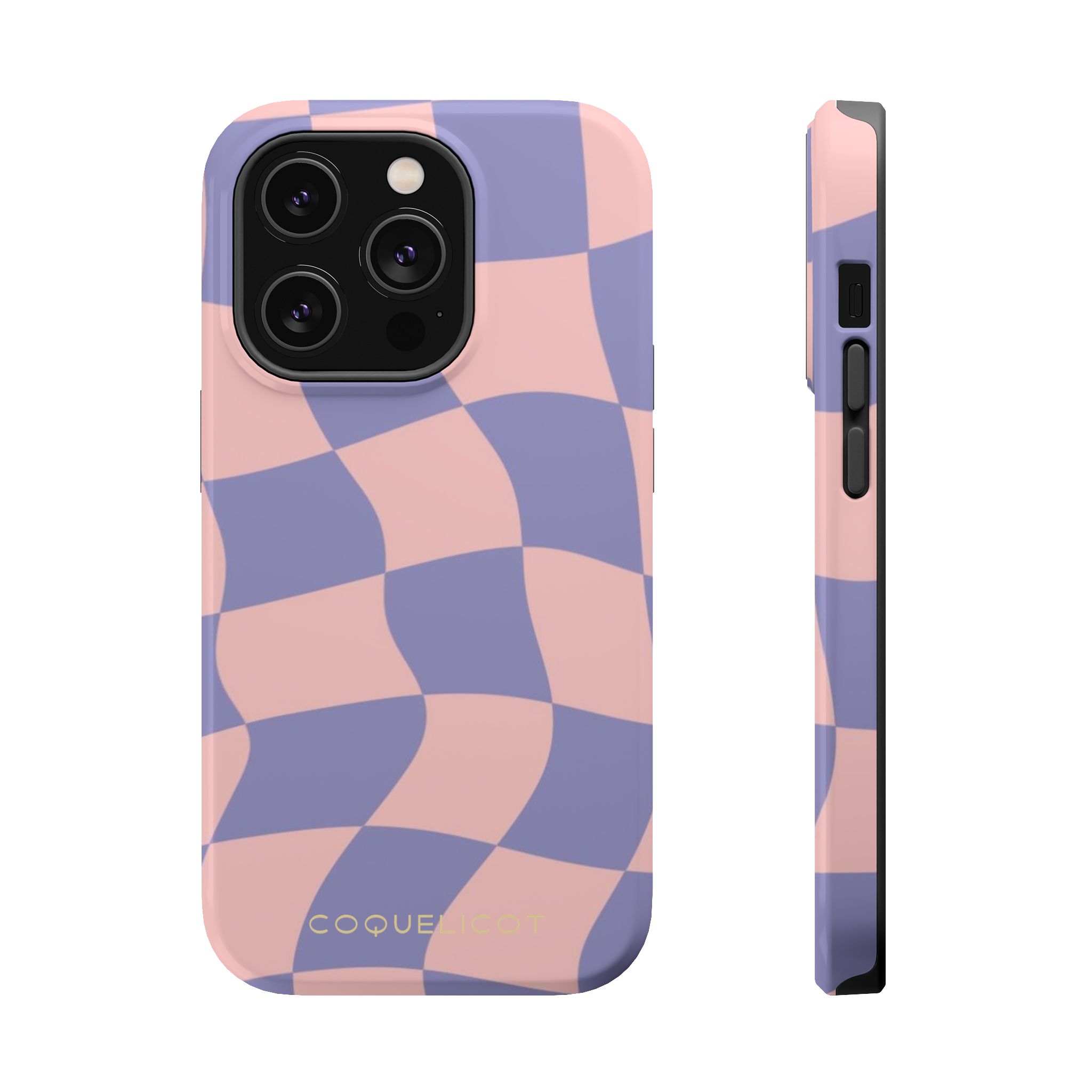 Su diseño ondulado en forma de tablero de ajedrez, en rosa chicle y lavanda suave, reinventa el patrón clásico con un toque de elegancia psicodélica.