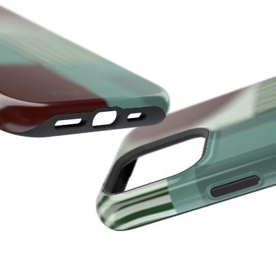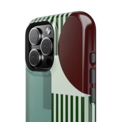 Les blocs colorés — entre vert profond, rouge et nuances de bleu grisé — s’organisent avec précision pour créer une composition équilibrée. Cette coque iPhone géométrique joue sur les contrastes et les proportions pour donner du rythme à l’ensemble.