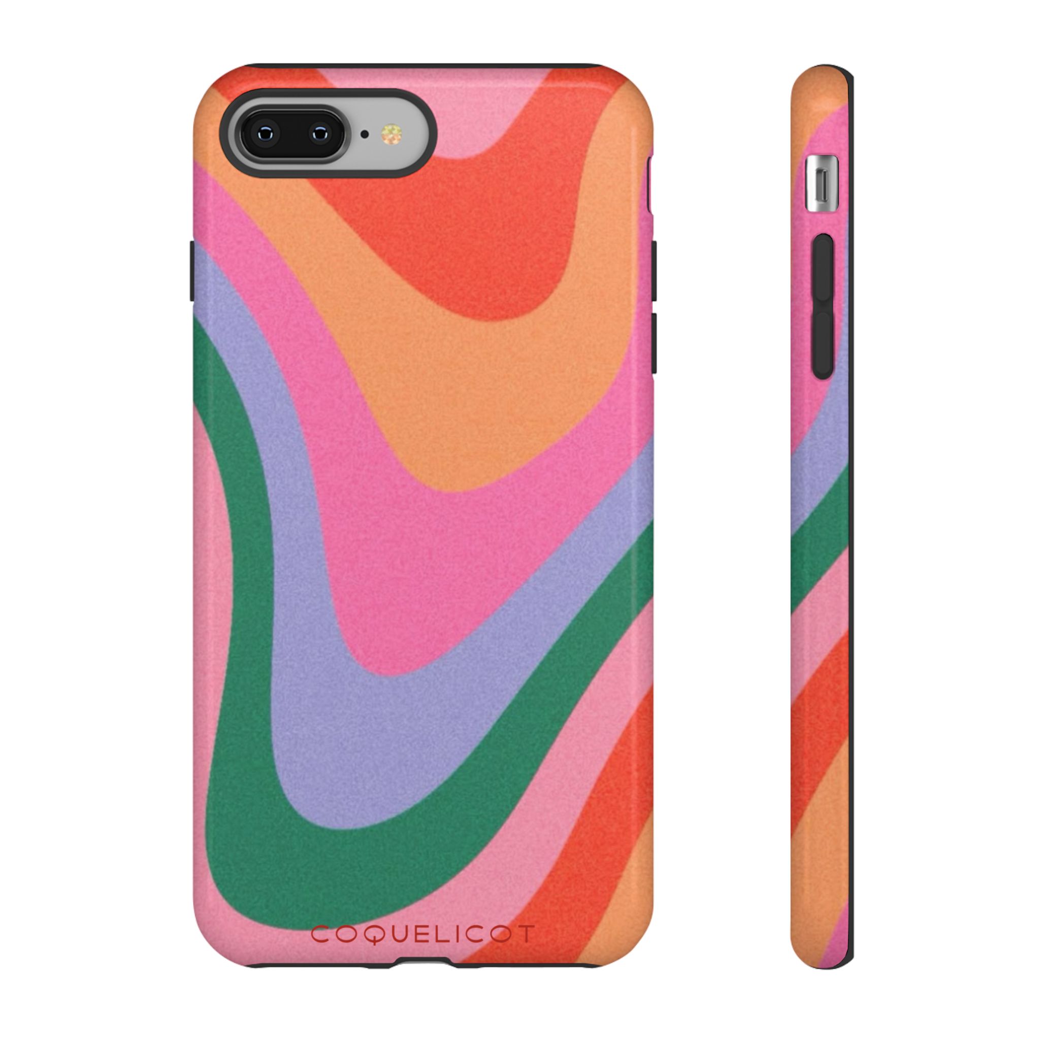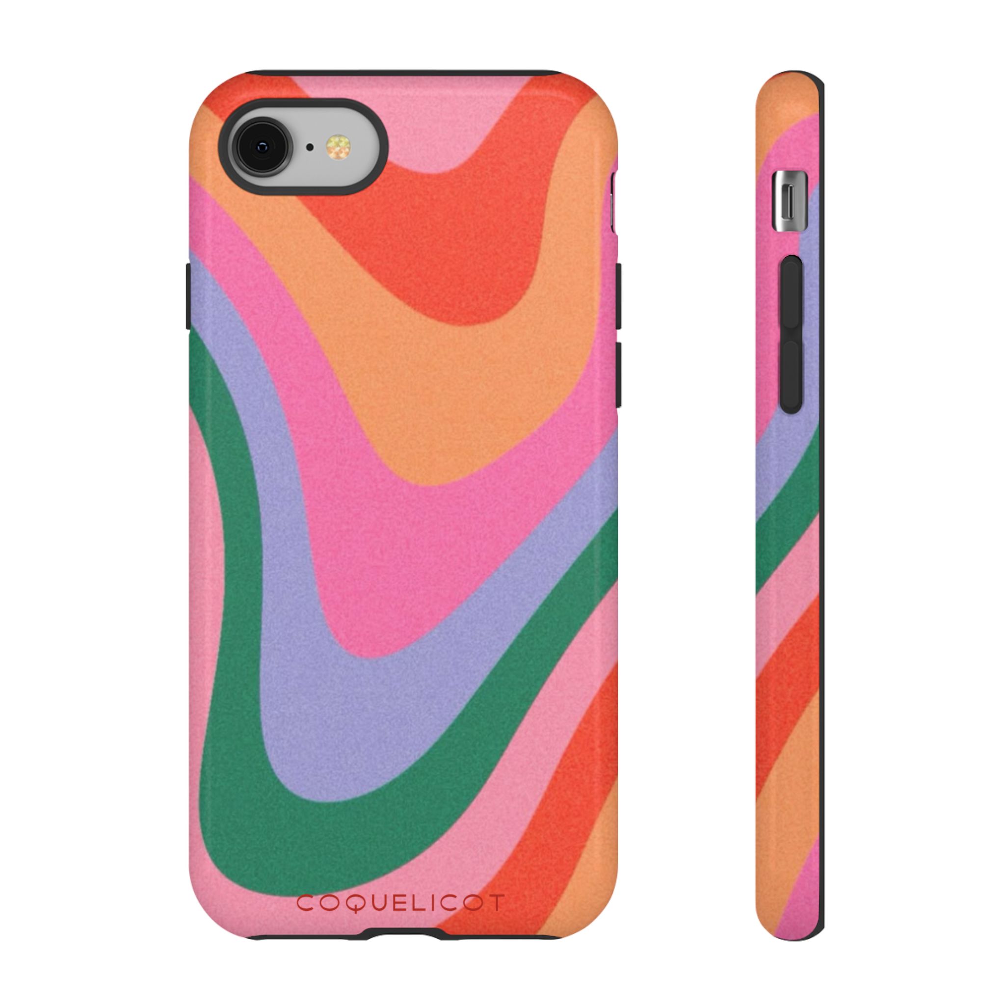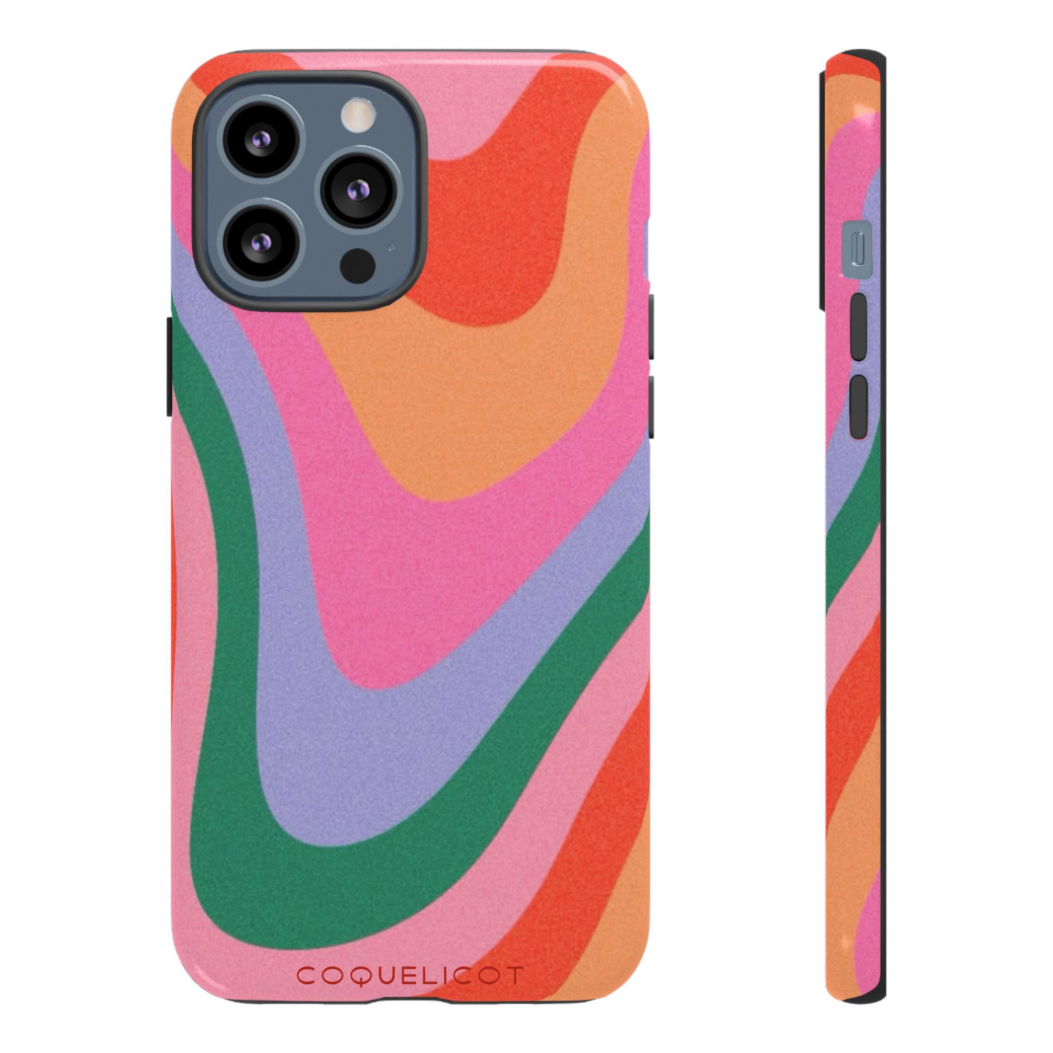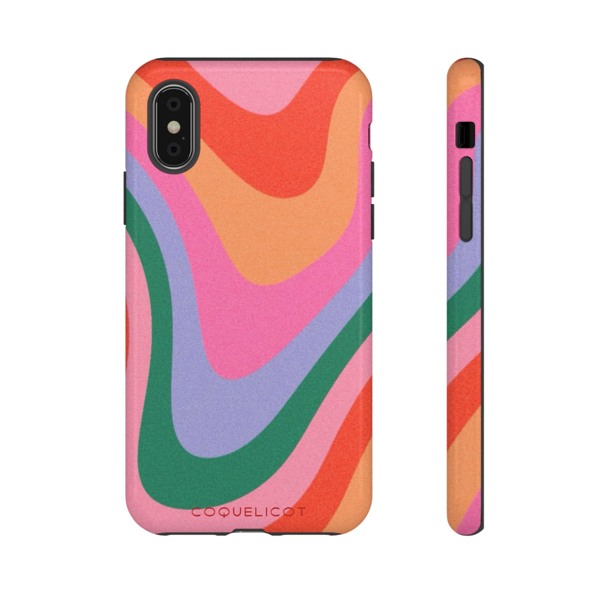 Les lignes ondulent, les couleurs se croisent, comme un rythme visuel en continu. C’est une coque qui ne reste pas statique — elle donne une sensation de mouvement, presque musicale.