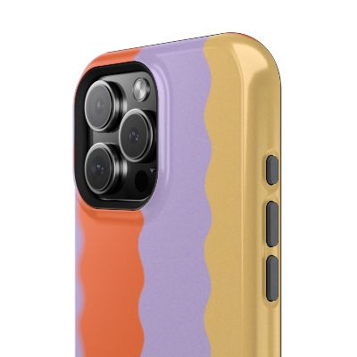 Les couleurs — entre orange chaleureux, violet doux et beige lumineux — se répondent naturellement, apportant un équilibre visuel à la fois simple et harmonieux. Cette coque iPhone colorée évoque un paysage abstrait, comme un horizon en mouvement.